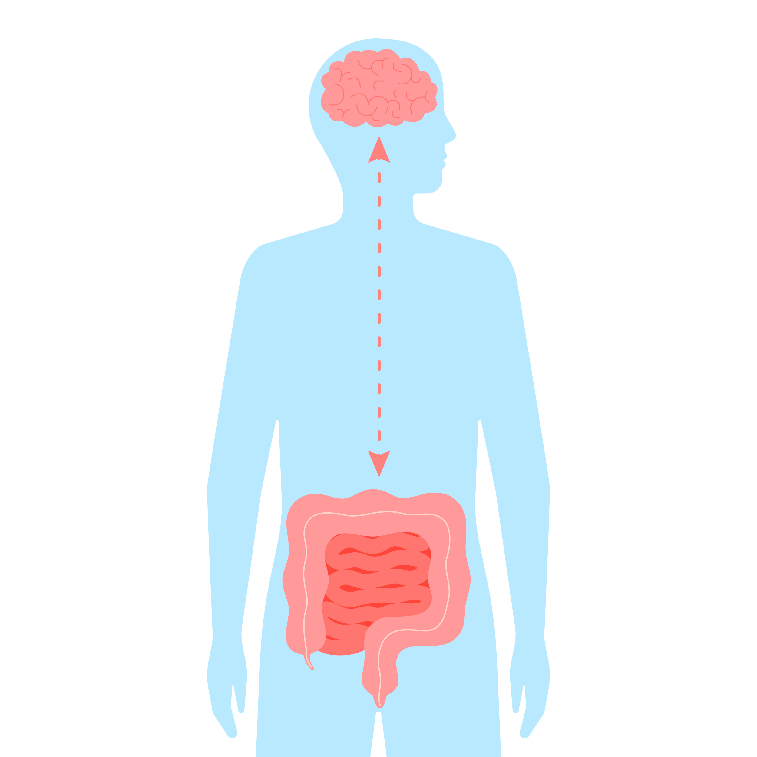 O cérebro tem um efeito direto no estômago e no intestino. Simplesmente pensar sobre comer algo, por exemplo, pode liberar o suco gástrico (principal substância responsável pela digestão das proteínas pelo estômago) antes mesmo que o alimento chegue ao estômago. O contrário também pode acontecer: se o intestino está sentindo algum desconforto, a área pode enviar sinais para o cérebro, causando irritação e ansiedade.